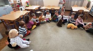 Dzieci z grup starszych brały udział w ,,Misiowych zadaniach” przygotowanych przez specjalnego gościa -Misia Henryka. Każda grupa miała do wykonania 3 zadania, po których wykonaniu otrzymywała część puzzla. Po zakończeniu zabawy należało połączyć ze sobą wszystkie zdobyte części puzzli.