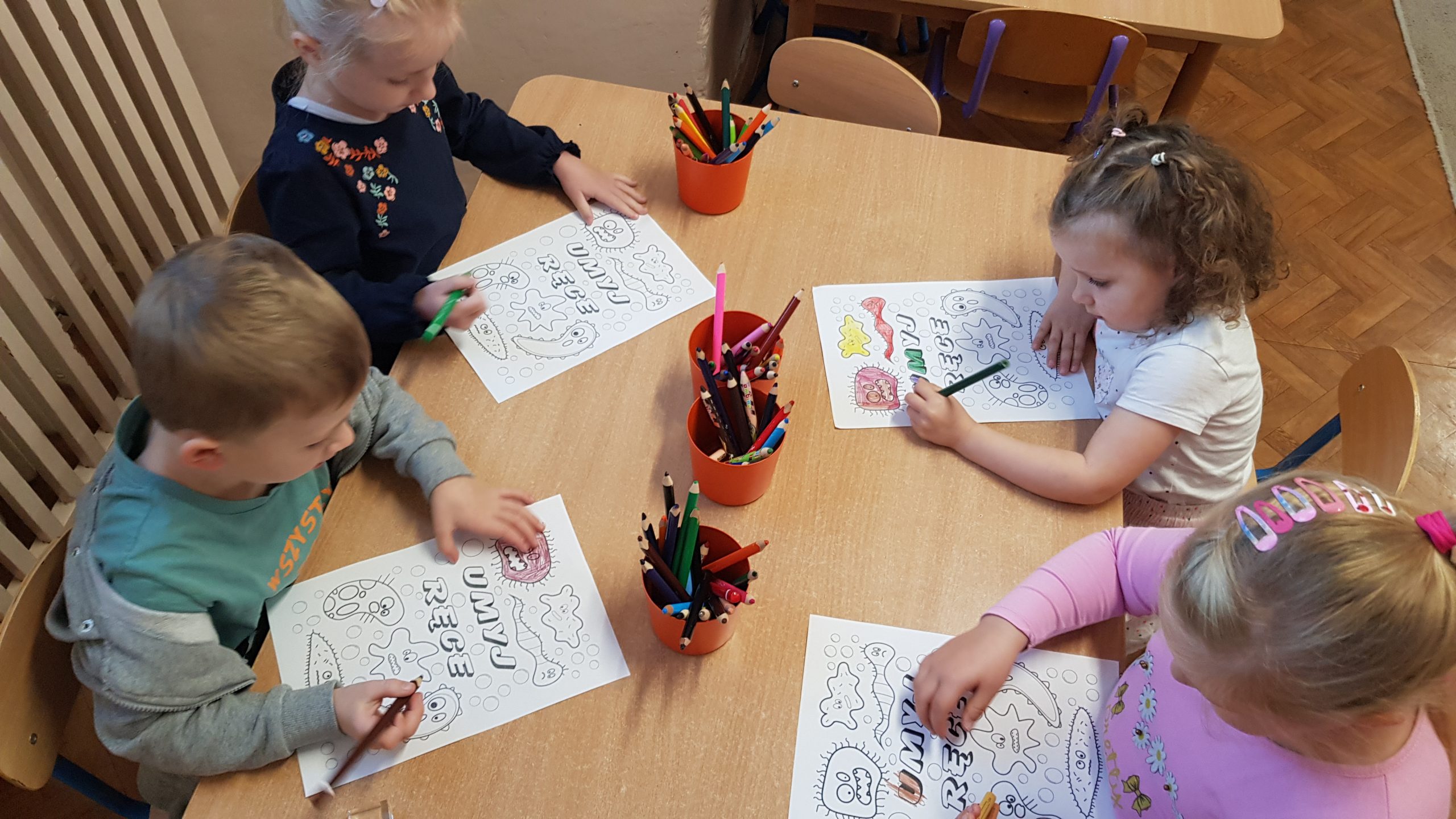 Głównym zadaniem naszego przedszkola jest dbałość o zdrowie i bezpieczeństwo dzieci. Jednym ze sposobów realizacji tego zamierzenia był udział naszych przedszkolaków w Światowym Dniu Mycia Rąk. Celem obchodów tego dnia było uświadomienie dzieciom, jak duże znaczenie dla ich zdrowia i życia ma mycie rąk, które może uchronić przed zakażeniem wieloma chorobami. Podczas tego dnia rozmawialiśmy na temat zarazków, bakterii i wirusów, które dostają się do naszego organizmu poprzez brudne ręce. Próbowaliśmy odpowiedzieć na pytanie: „Dlaczego i w jakich sytuacjach powinniśmy myć ręce”, omówiliśmy także schemat mycia rąk oraz zastosowaliśmy go w praktyce. Ponadto wspólnie wykonaliśmy eksperyment pokazujący jak wirusy i zarazki boją się mydła i czystych rąk.